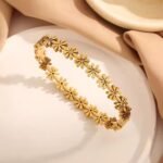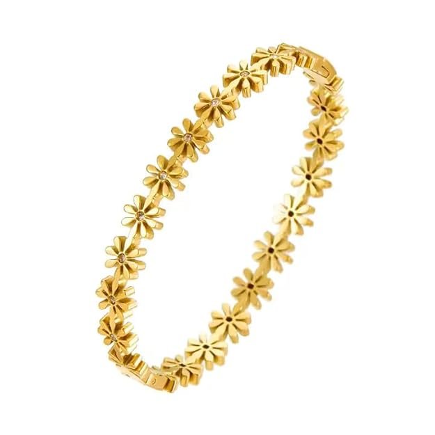 Gold Daisy Flower Stone Bangle Bracelet is a beautifully crafted jewellery piece designed for women who love elegant floral styles. Featuring delicate daisy flower motifs with sparkling stone accents, this bracelet adds a feminine and graceful charm to your look.