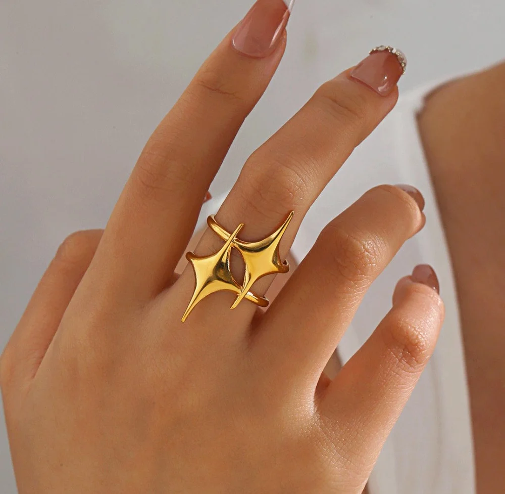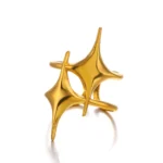 Gold Distinctive Twin Stars Adjustable Ring is a bold and modern statement jewellery piece designed for women who love unique and artistic accessories. Featuring two abstract star shapes crossing elegantly, this ring creates a striking and contemporary look.