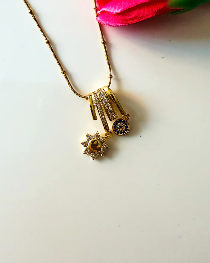 Gold Smiley Sun Charm Necklace is a vibrant and stylish jewellery piece designed to add positivity and charm to your everyday look. Featuring a radiant sun-shaped pendant with a smiley detail and an elegant blue charm accent, this necklace blends playful design with modern elegance.