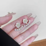 The upper part showcases a beautifully crafted small flower with a subtle textured finish and a golden center accent, giving it a fresh and youthful charm. Below the flower, a curved row of tiny pearls sits perfectly along the earlobe, creating a trendy double-layer illusion effect.