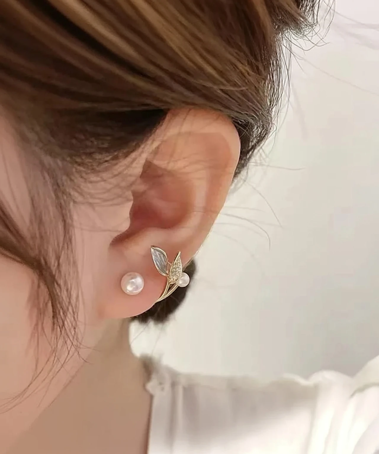 Korean Shimmery Petals Pearl Stud Earrings are a graceful blend of elegance and modern Korean fashion styling. Designed with delicate petal-shaped detailing, subtle shimmer accents, and a classic pearl drop, these earrings create a soft and feminine look.