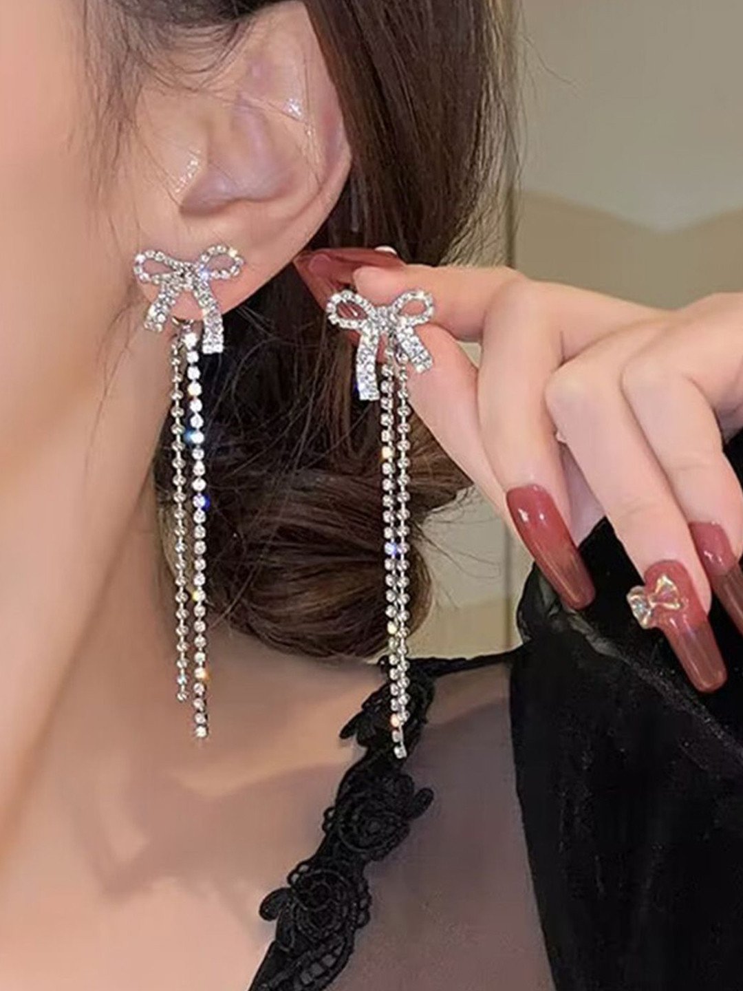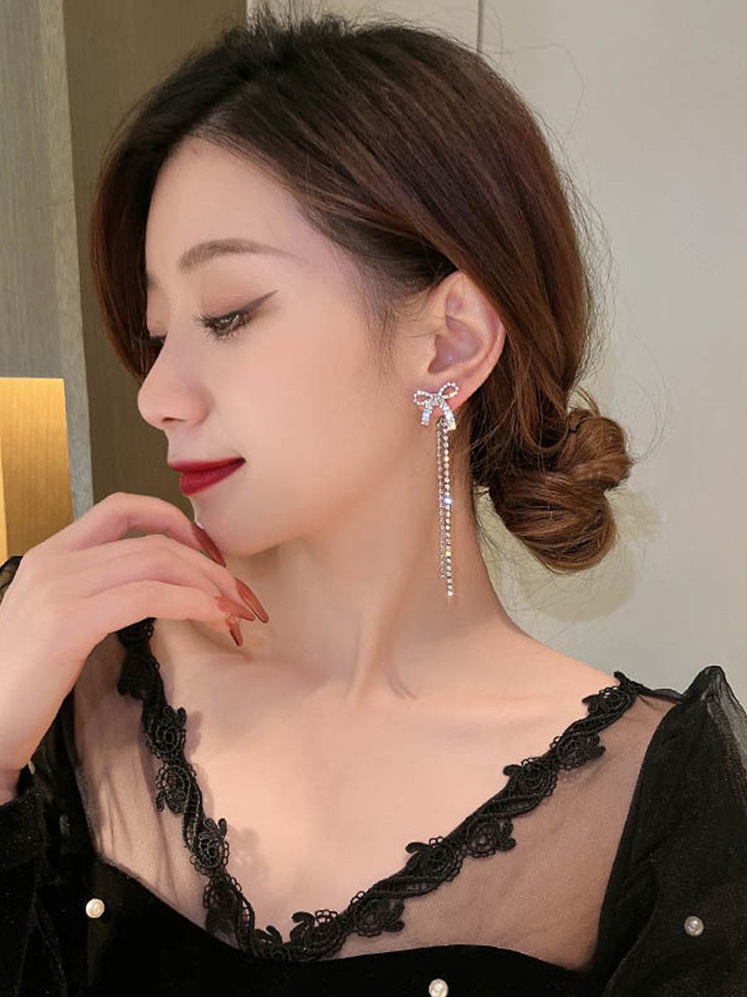Silver Plated Korean Bow Long Earrings are elegant statement earrings inspired by modern Korean fashion trends. Designed with a sparkling bow stud and long cascading chain drops, these earrings create a graceful and glamorous look.
