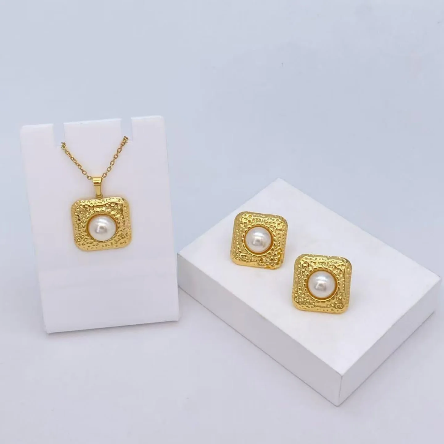 The pendant and matching earrings feature a distinctive square textured design that gives the jewellery a bold and artistic look. At the center of each piece sits a smooth pearl that adds sophistication and a luxurious touch to the overall design.